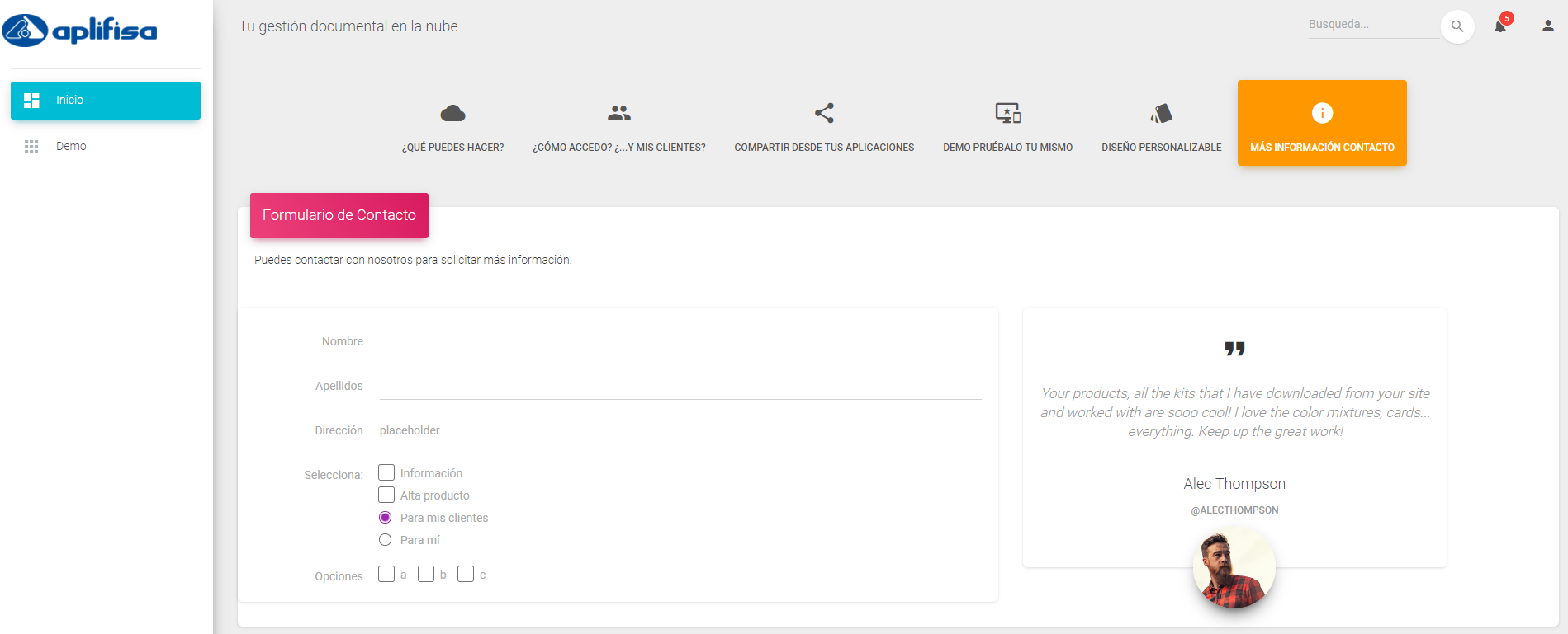 Al tratarse de una demo, los ficheros subidos no quedarán almacenados en el servicio, y por lo tanto no será posible descargarlos. No obstante podrá explorar el disco virtual y utilizar el resto de las opciones.